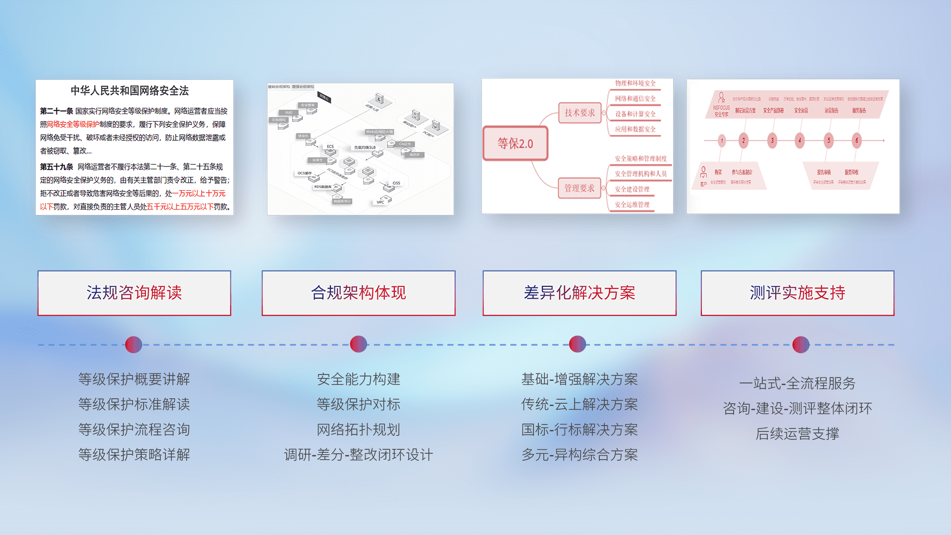 通过专业的法律咨询解读、、、合规架构体现、、差异化解决方案、、测试实施支持等服务,,为客户量身打造等保合规体系。。。。